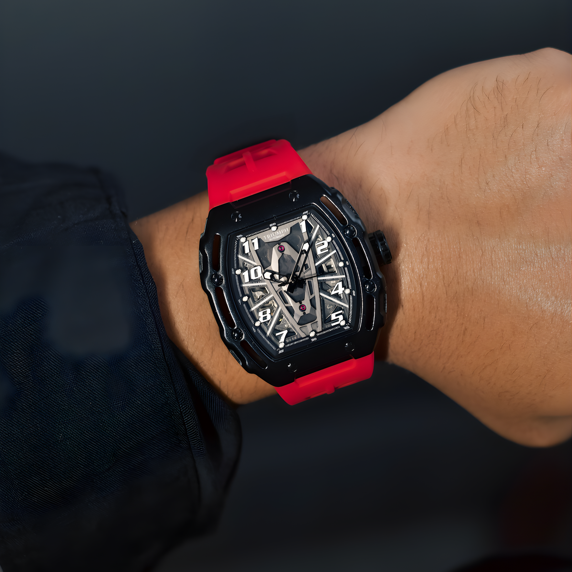 A celebration of mechanical architecture, the Phantom’s skeletonized design reveals the intricate beauty of its automatic movement. Each cutout, gear, and bridge is meticulously placed to balance aesthetics and functionality — giving you a timepiece that moves as boldly as you do.