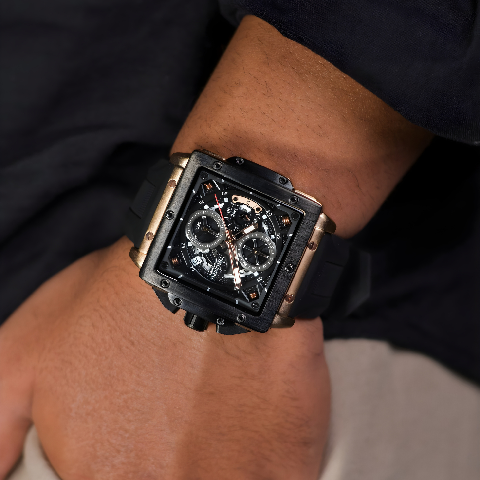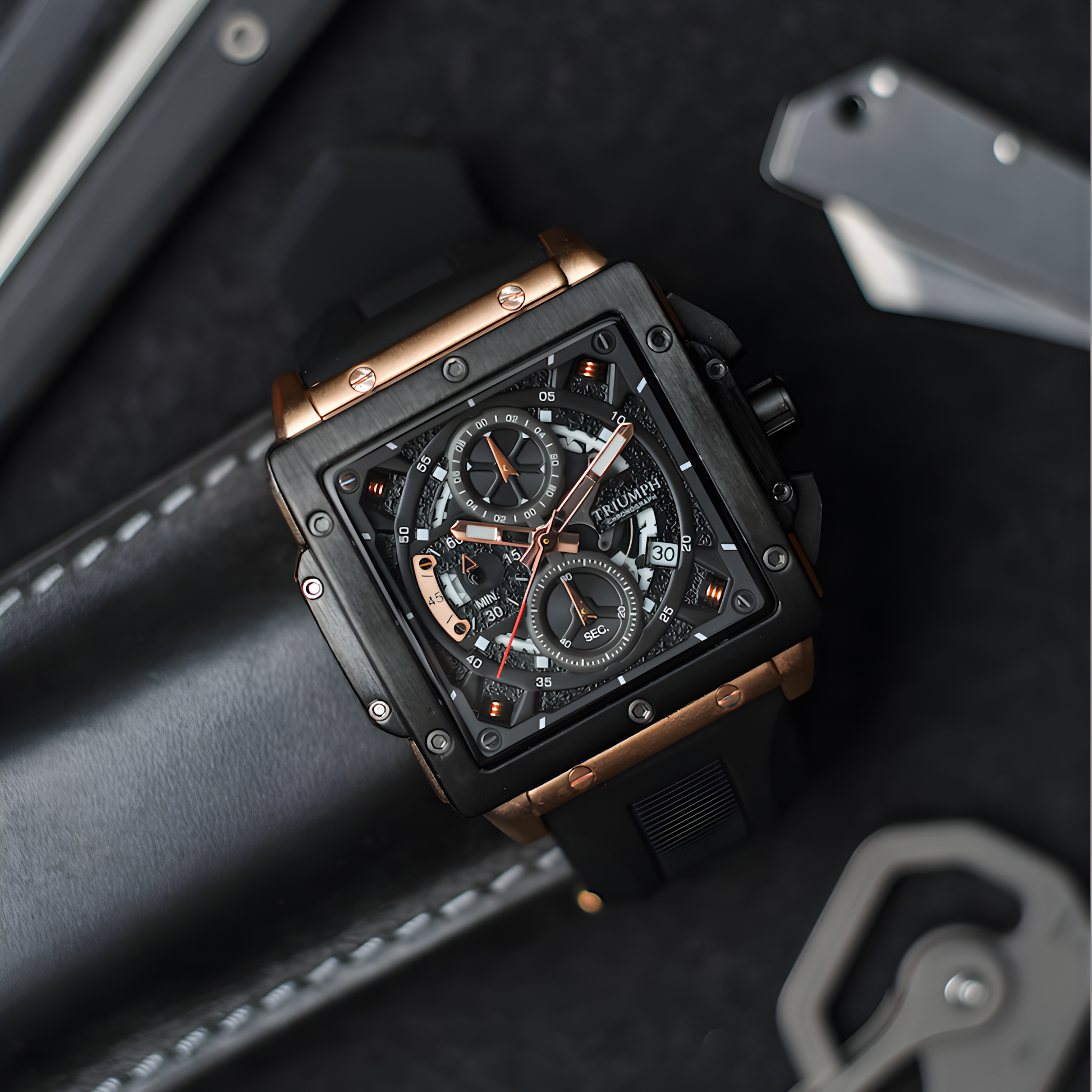 The Zeus features a striking multi-layer dial with exposed chronograph architecture, giving the watch a powerful, industrial presence. Every screw, bevel, and subdial is crafted with purpose — creating a design that blends complexity, clarity, and attitude.