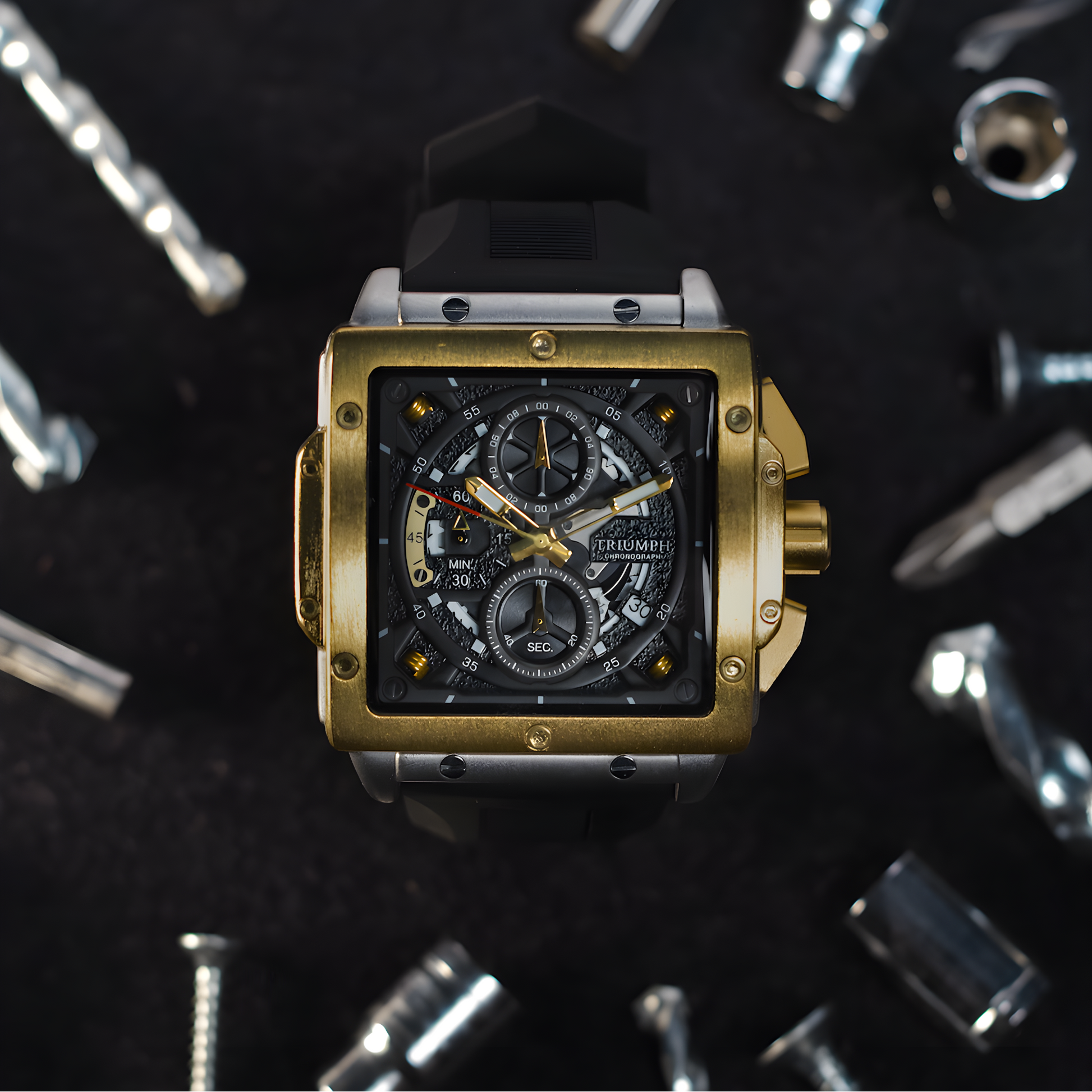 The Zeus features a striking multi-layer dial with exposed chronograph architecture, giving the watch a powerful, industrial presence. Every screw, bevel, and subdial is crafted with purpose — creating a design that blends complexity, clarity, and attitude.